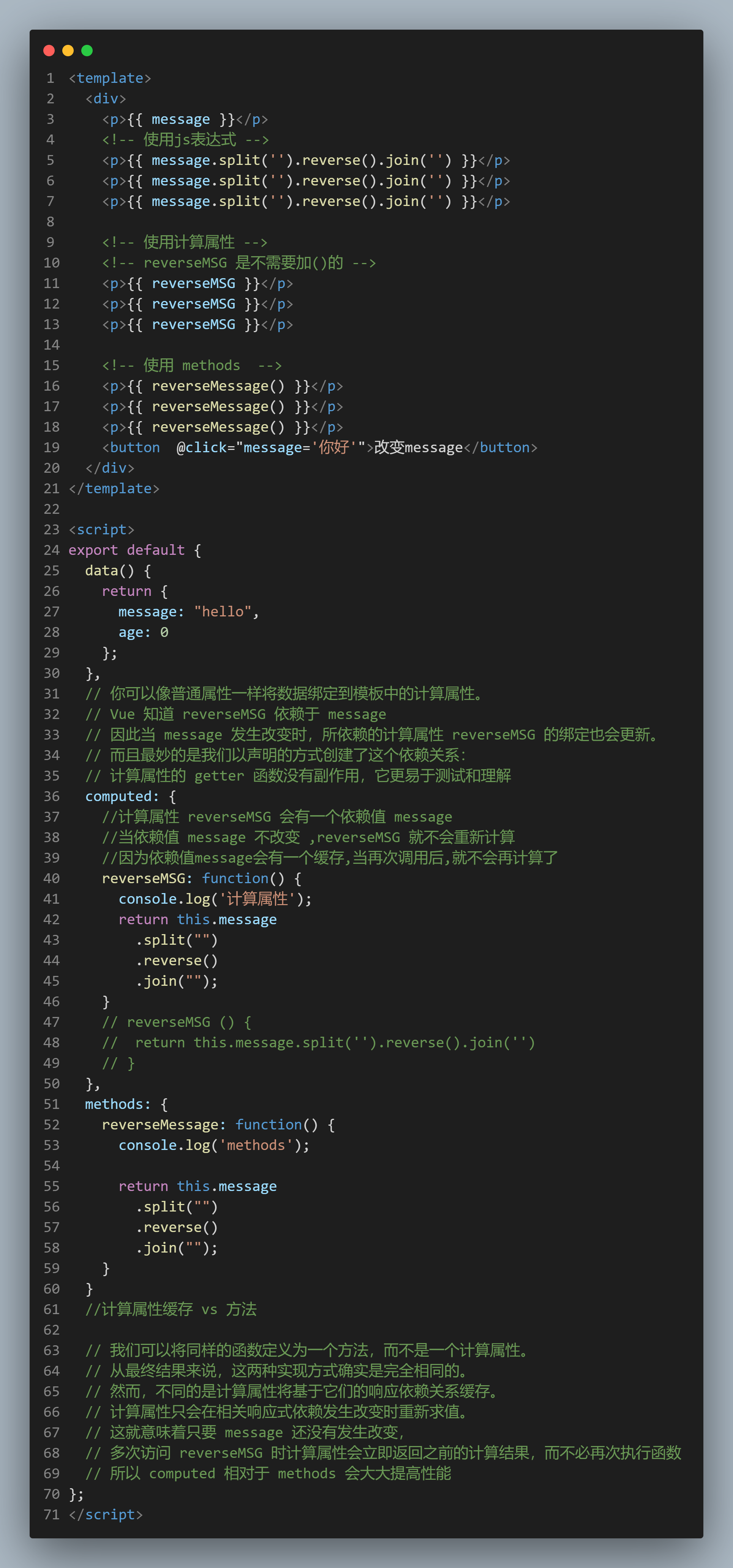 // 多次访问 reverseMSG 时计算属性会立即返回之前的计算结果,而不必再次执行函数